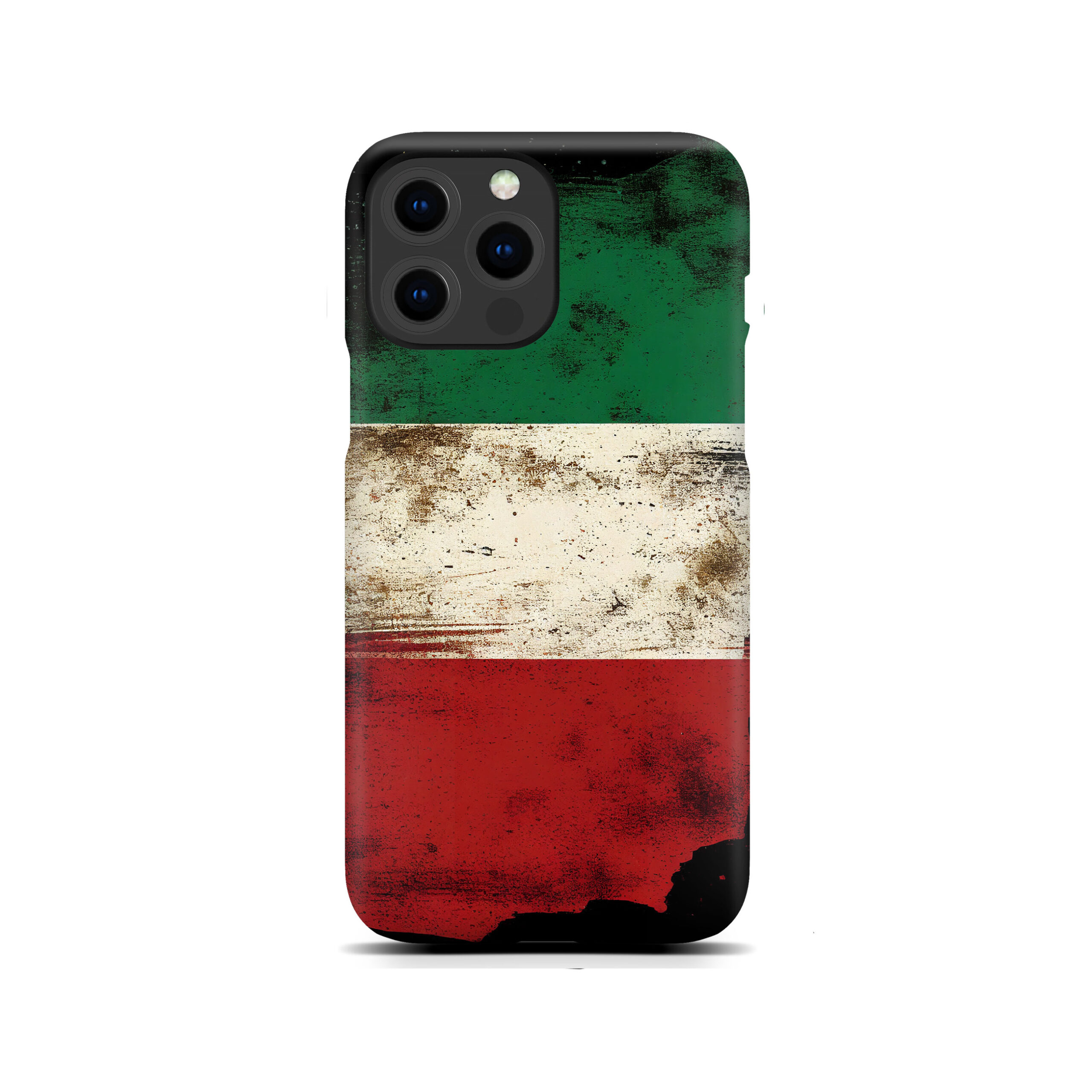 This artwork showcases the Italian flag with green, white, and red vertical stripes. Each stripe appears worn and textured, with a distressed overlay adding depth and a sense of age. The green stripe has darker, mottled patches, the white appears faded and stained, and the red stripe features darker hues with subtle splatters. The overall grunge effect gives the flag a raw and vintage aesthetic, highlighting imperfections and adding an artistic edge that evokes history and resilience.